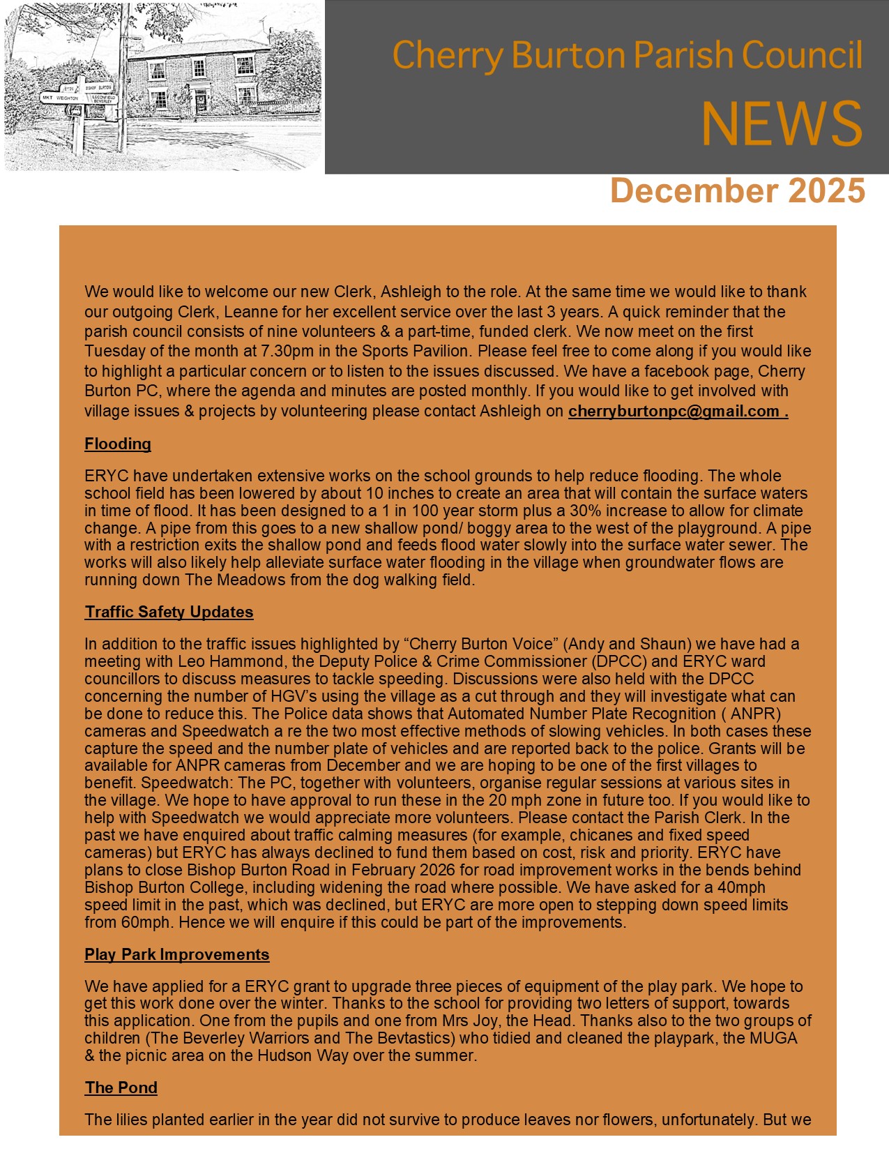 Please contact the Clerk to Cherry Burton Parish Council if you have any parish news that you would like to see on this web site, the village notice board or in the next edition of Village News;